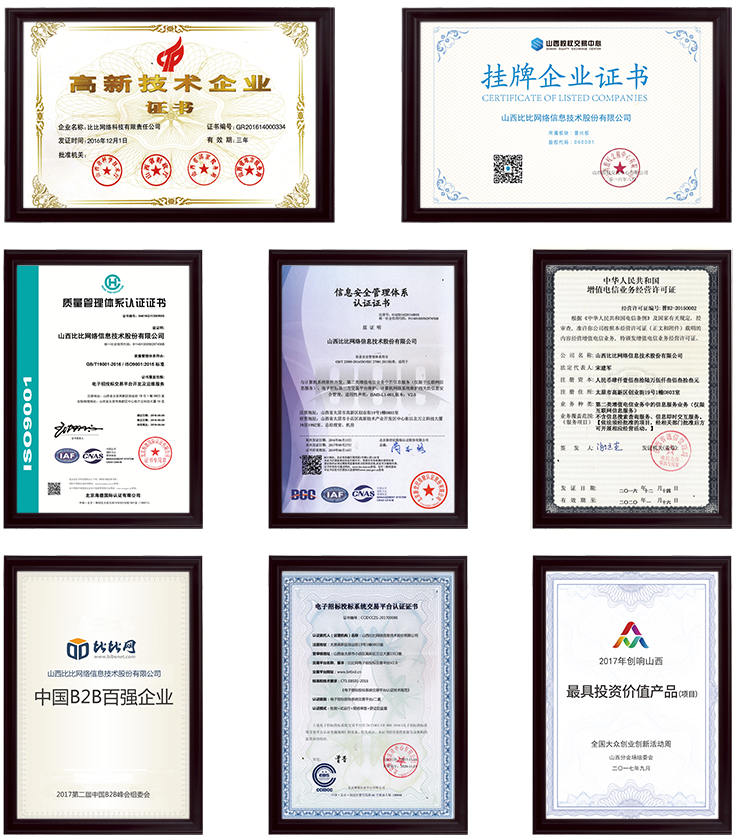 公司成立至今已先后獲得工信部頒發的ICP備案證書;公安部頒發的三級網絡安全認證證書;國家版權局頒發的45項軟件著作權;通過ISO9001、ISO20000和ISO27001三大國際管理體系認證;比比網是國家發改委頒發的第一批電子招標試點平臺,公司已在多省建立營銷體系并輻射全國,并與國家、山西、內蒙、陜西、河南、山東、河北等招投標公共服務平臺對接。現已獲得中國電子招標投標系統二星認證;2017年比比“招標生態系統”項目獲得全國大眾創業萬眾創新“最具投資價值產品”大獎;企業入選年度中國B2B企業百強,成為同行業唯一入選企業。2018年,比比網作為國內領先的“互聯網+”投標采購服務商,應邀參加了2018中國產業互聯網領袖年會,并從近千家企業中脫穎而出,一舉斬獲“中國產業互聯網百強企業”。