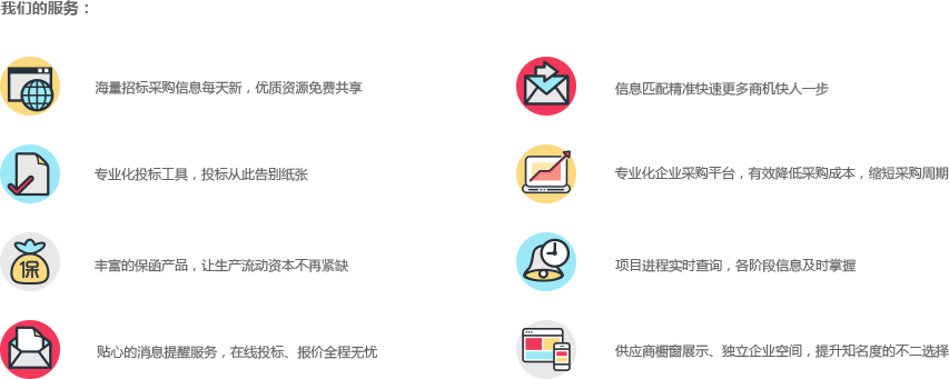 網站每天更新90000余條各類采購招標公告、預告,各類項目信息、合作信息,涵蓋建筑建材、機械電氣、信息產業、交通運輸、綠化環保、水利電力、儀器儀表、能源化工、服裝紡織、印刷包裝、農林牧漁、物資專材、消防安全 、電子電工、廣電通訊、辦公設備、文體娛樂、醫療衛生、冶金礦產、專項服務等,區域覆蓋全國34個省市區及其眾多的二級城市的各類標訊,累計發布信息近兩千萬條。